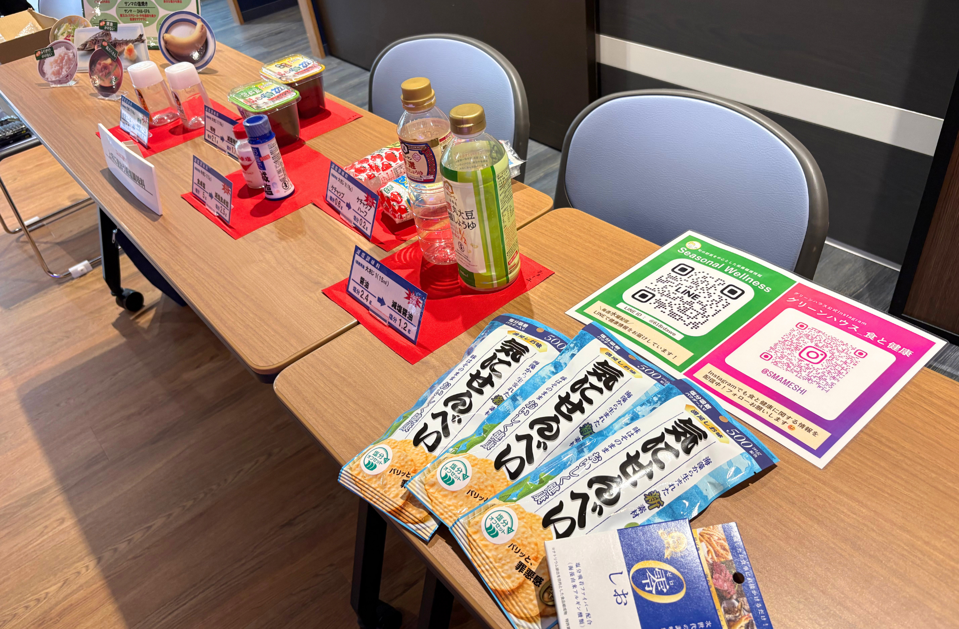 会場内ではメディカルアナライザーを用いた「血管年齢チェック」が実施されたほか、減塩商品の製品展示コーナーを設置。当社の気にせんべいや同じ「塩分オフセット技術」を用いた調味料「零しお」も実際に手に取ってご覧いただける場を提供しました。