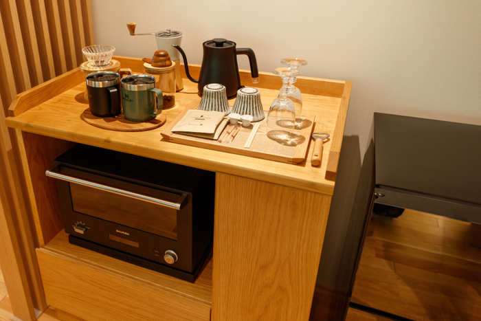 冷蔵庫や電子レンジの設備の他、地元のコーヒー専門店「HONOKA COFFEE」(ほの香)とのコラボしたオリジナルコーヒー豆や、フルーツジュース、ワインなどをご用意しています。