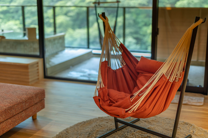 それぞれタイプが違う100㎡~のスイートルームは、プライベートで楽しめる源泉かけ流し露天風呂と里山の景色が見えるロウリュサウナ付き。サウナで汗をかいた後は、優しい風がそよぐハンモックテラスで外気浴で“ととのう”滞在ができます。里山を眺めて「何日でも居たくなる、ここち良さ。」を体感いただけます。