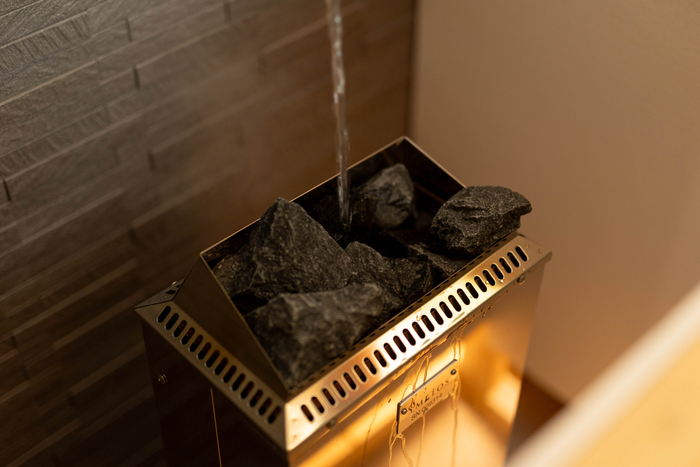 サウナの本場・フィンランド式ロウリュは『ゆっくりと降り注ぐ熱気』のこと。熱したサウナストーン(香花石)に水をかけると瞬く間に、心地よい熱波と蒸気となってサウナ室内を満たし、自然な対流を生みながら、発汗を促します。水の量によって蒸気の量をコントロールして、お好みのサウナ環境を作ることができます。