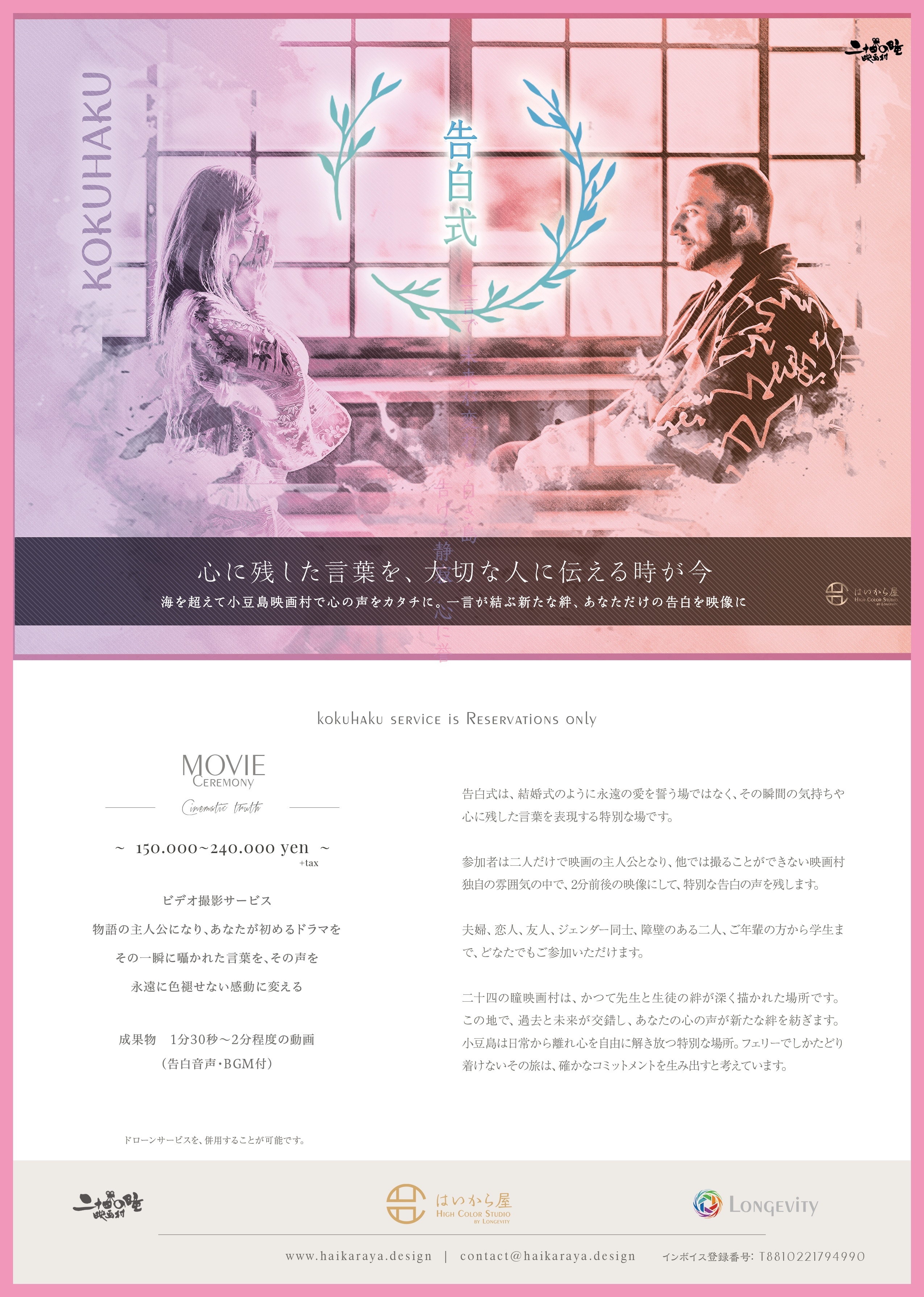 「告白式」は、あなたの心にある大切な想いを、特別な人に伝えるための儀式です。現代社会において、直接言葉にすることの難しさを感じる方々に、このサービスは新たな道を提供します。はいから屋の特別な空間で行われるこの儀式は、ただの告白の瞬間ではなく、あなたの感情や想いを真剣に形にする場です。そしてそれを映画の主人公のように撮影し、永遠と残すことができます。もちろん参加される方は皆さまそんな経験はなく撮影が初めての方向けのサービスですので、どなたでもお気軽にご参加いただけます。