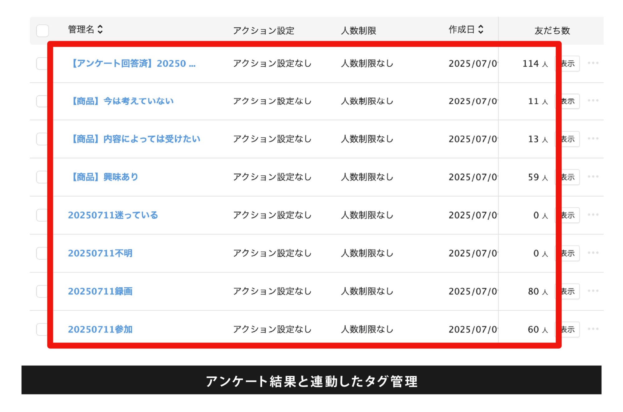 YouTubeライブ告知時などにアンケートを実施し、回答内容に応じて自動でタグ付け。