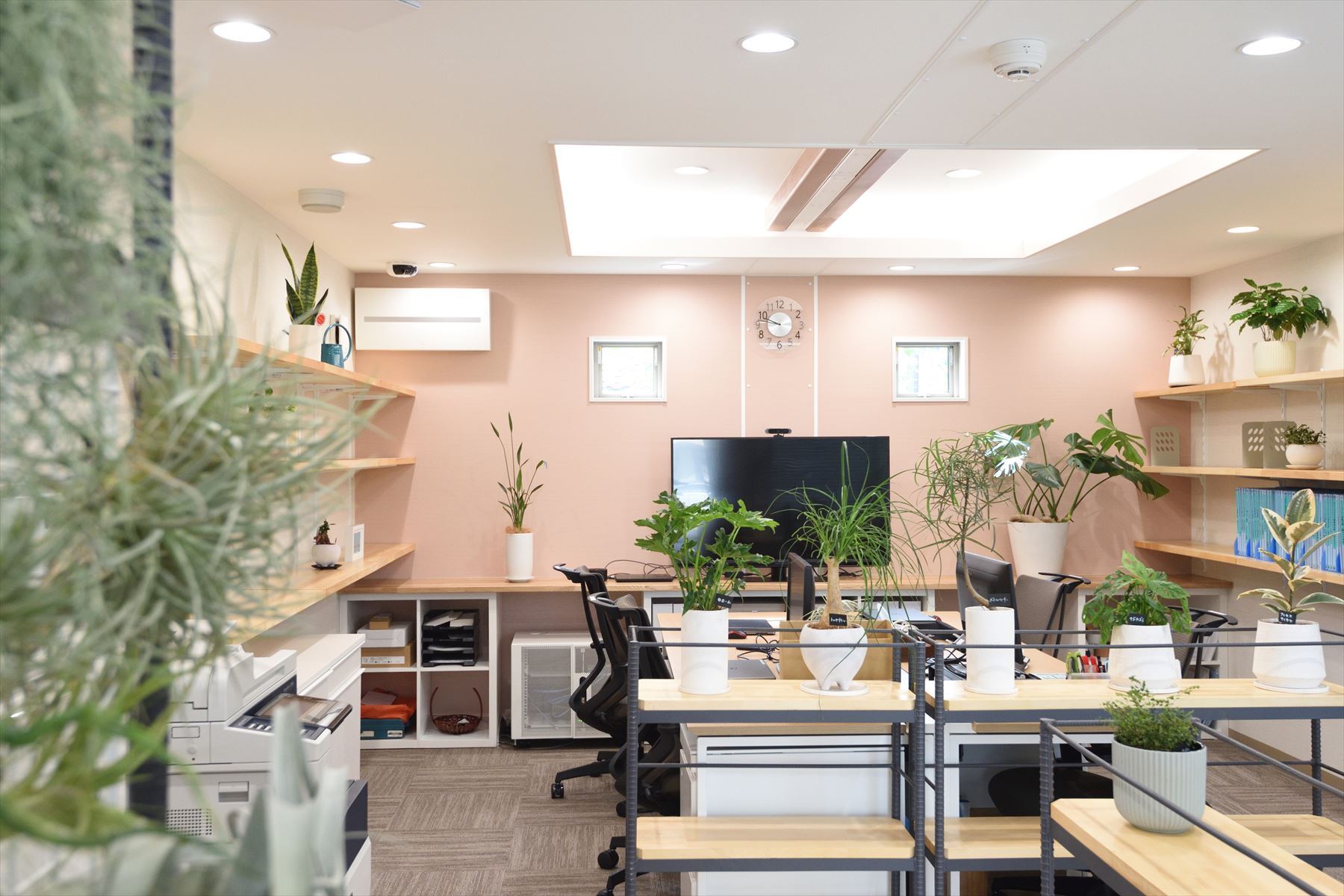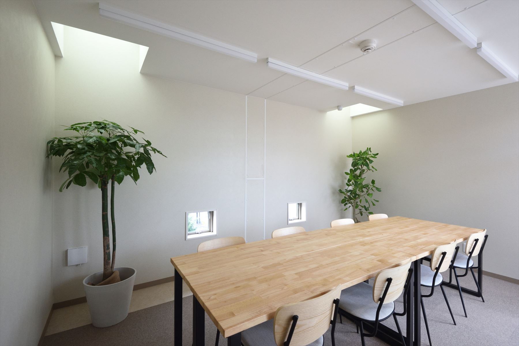 1階のワークスペースには木漏れ日をイメージする光が射し込む小窓を、また2階のミーティングルームには小窓に加えて天窓も設置し、屋内各所に観葉植物を配置することで「光と緑あふれるナチュラルオフィス」をコンセプトにした空間に仕上げました。