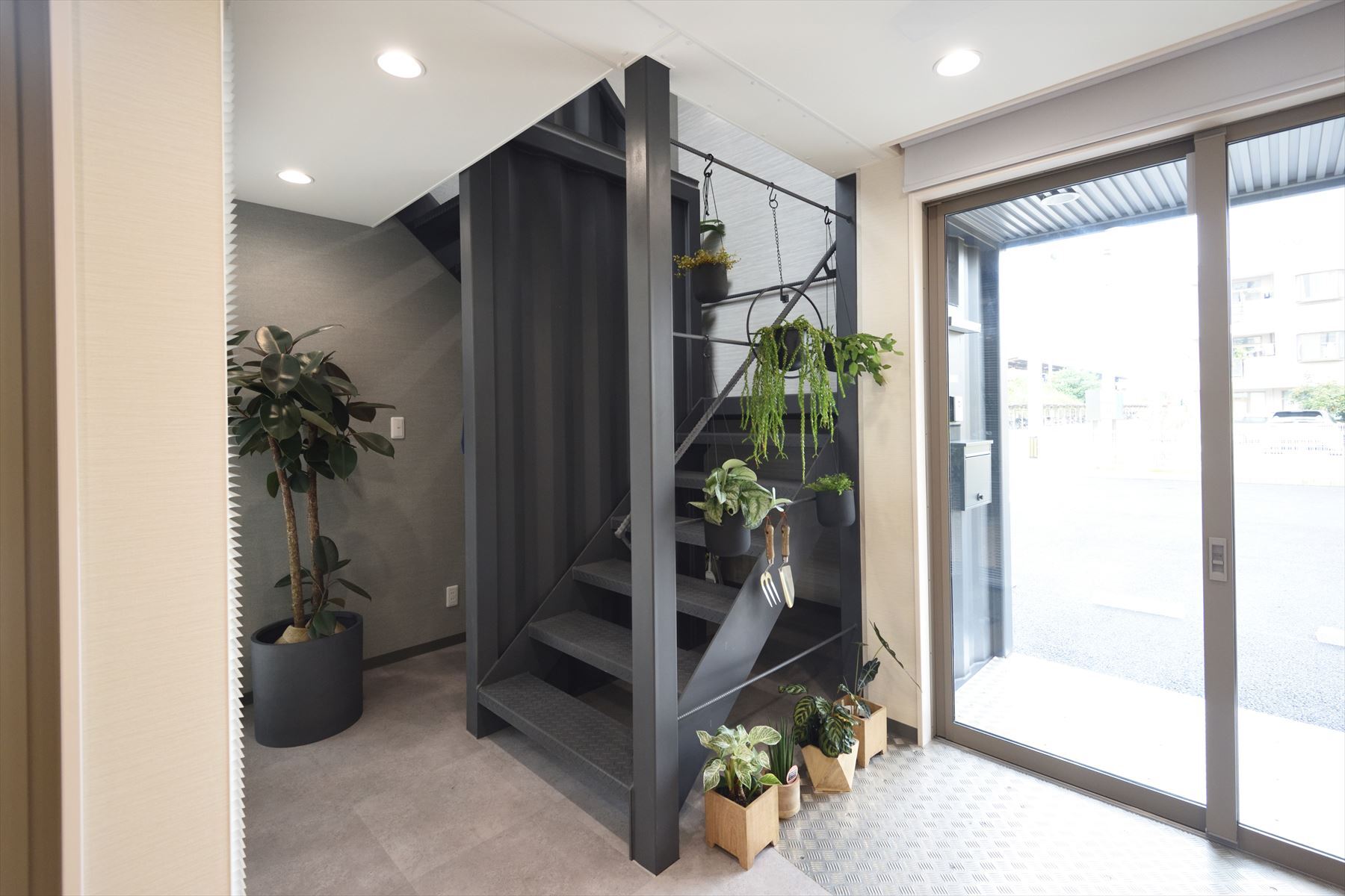 全体的に緑をイメージしながらも、所々にはコンテナ自体の硬派なイメージでもある、コルゲート鋼板がむき出しになっている壁面や、鉄筋が手すりとして使われている階段、そして、エントランスの床面や水回りスペースにはダイヤモンドパターンの金属板を使用するなど、随所にコンテナ建築としての特徴的なデザインも見られる屋内になっています。