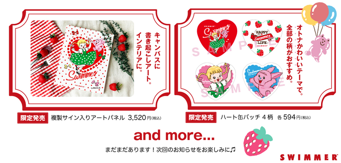 Collection at マルイを開催します。2020年秋に復活したSWIMMER。今回は、SWIMMER を使ってくださっていた皆様が今も使える、楽しめる、大人かわいいSWIMMERをテーマに、当イベントの描き下ろし先行アートや、ディレクターであるひづめみか〜るの特別イベントなど、キュートなSWIMMERを感じて楽しめる展示と限定グッズを含む新しいSWIMMERアイテムを販売いたします。本日は、限定、先行アイテム、そして新しいSWIMMERが自信をもっておすすめするPICK UPアイテムを一部お知らせいたします。