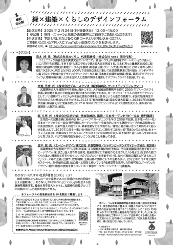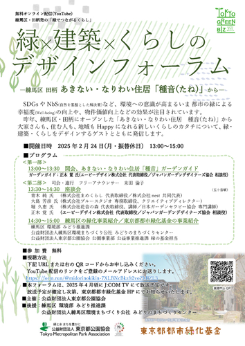 これからの東京の街づくりと緑のあり方を考える!2月24日(月・休)練馬区田柄発「緑×建築×くらしのデザインフォーラム」をYoutube生配信|東京都都市緑化基金