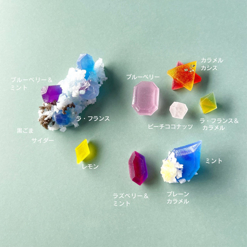 砂糖と寒天からできた和菓子の一種、琥珀糖。「こうぶつヲカシ」はこれに鉱物や宝石のイメージを加えた、アート作品のようなお菓子です。石の美しい佇まいを想像しながら、ひとつひとつ職人の手で切り出しており、どれひとつとして同じものはない唯一無二の作品が出来上がります。また、天然由来の色素を使った繊細な色のグラデーションの表現や、リキュールや果汁を使った多彩な味のバリエーションもこうぶつヲカシならではの魅力のひとつです。こうぶつヲカシという名前は、大好物と鉱物をかけ、いとをかしなお菓子として名づけました。