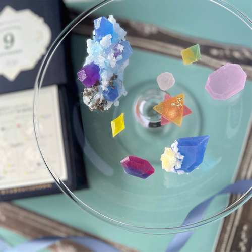 琥珀糖は、表面はシャリっと、中はしっとりな不思議な食感が特徴の和菓子です。天然由来の色素で色とりどりに表現したこうぶつヲカシは、色によって異なる様々な味わいをお楽しみいただけます。サファイアの青色は、ミント味。ミントの葉を煮詰めた自家製ミントシロップが織りなす味わいは、スッキリとしたミントの爽やかさをお楽しみいただけます。