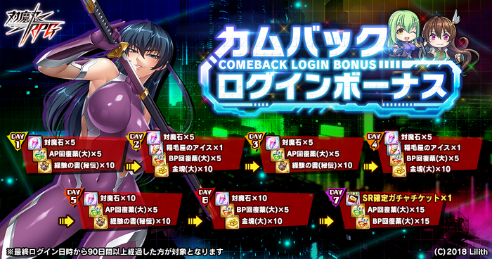 対象となるお客様は期間中に再度ログインしていただくことで豪華ログインボーナスをプレゼント!ログイン7日目には「SR確定ガチャチケット×1枚」をプレゼントいたします。