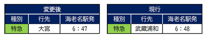 (3)【平日】夕方のラッシュ時間帯(18時30分~20時ごろ)の急行海老名行きについて、二俣川駅で同一ホームに必ず各停湘南台行きが停車しているように変更します。