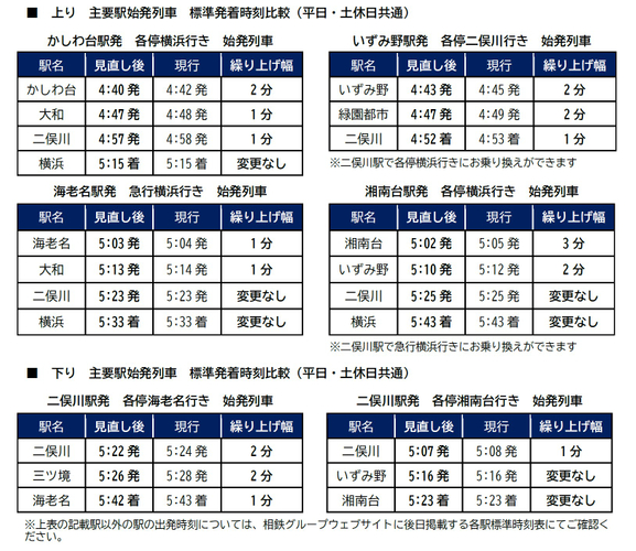 (2)【平日・土休日】日中時間帯(12時30分~16時ごろ)および夜間時間帯(21時30分~23時ごろ)、各停横浜行きと各停湘南台行きの二俣川駅での停車時間を1~2分程度短縮します。これにより、いずみ野線をご利用のお客さまのお乗り換えがスムーズになります。