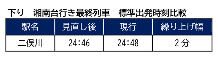 (4)【平日・土休日】下り最終かしわ台行きと最終湘南台行きの二俣川駅でのお乗り換えをスムーズにするため、最終かしわ台行きの出発番線を2番線から1番線に変更します。それに伴い、2番線から出発する最終湘南台行きの出発時刻を2分繰り上げます。