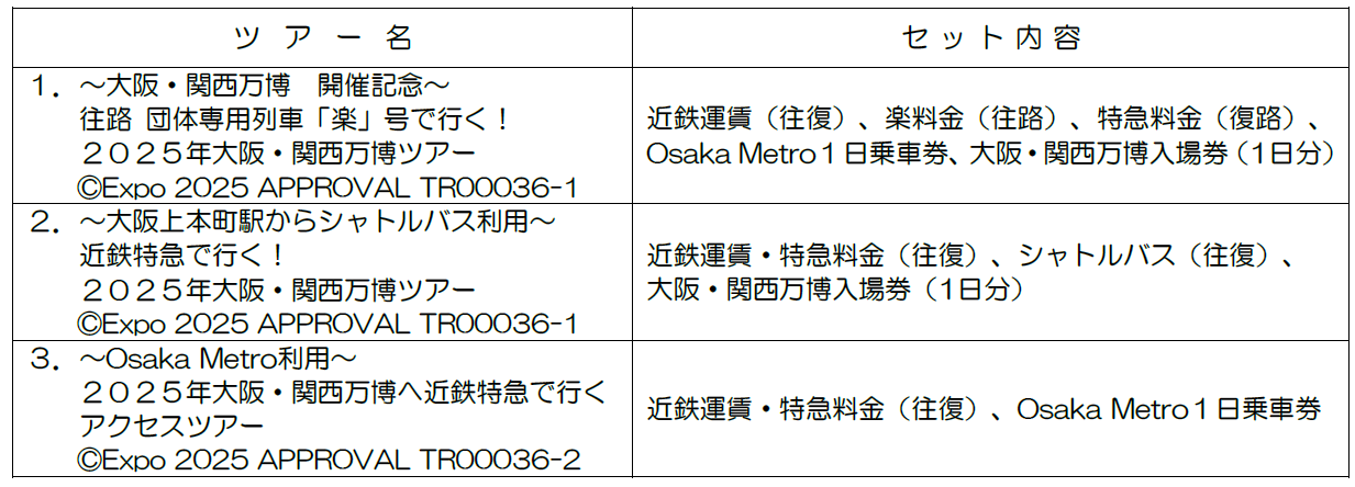 今回発売するツアーは、開催初日の4月13日(日)に、往路を団体専用列車「楽」号で行くツアー、近鉄特急と大阪上本町駅からのシャトルバス、万博入場券がセットになったツアーのほか、近鉄特急とOsaka Metro1日乗車券がセットになったアクセスツアーなど、3コースご用意しました。