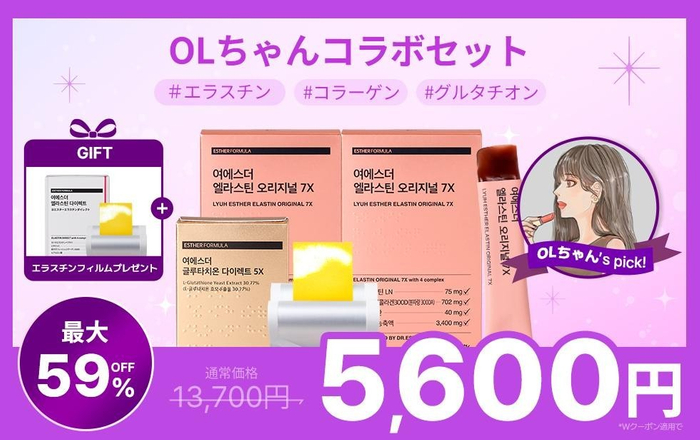 OLちゃんがおすすめするエラスチン×グルタチオンセットがメガ割特価で登場。エラスチンオリジナル7Xゼリー2箱に加え、ヨエスターグルタチオンダイレクト5X1箱と人気商品をセットでお得に購入可能です。エラスチンの働きでしなやかな肌印象を演出してハリツヤをアップし、グルタチオンで肌のくすみをケア、明るさを引き上げ、うるツヤ×ハリ感×透明感を実感できます。持ち運びに便利で簡単に摂取できるため外出先や忙しい日常にも手軽に取り入れられます。そして、メガ割期間内購入者全員にエラスチンフィルムを無料プレゼント中です。この機会をどうぞお見逃しなく。