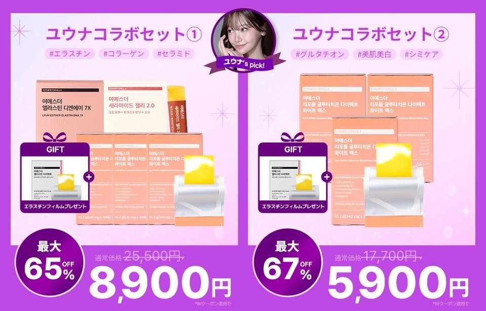 ユウナさんのオススメ商品を厳選した「ユウナセット」がメガ割限定で登場します。今回、全二種のオプションセットをご用意させていただきました。コラボ企画セット①では高純度グルタチオンを主要成分とする美白ケアアイテムの「リポソームGLTホワイトマックス」3箱セットと肌の弾力とハリをサポートするエラスチンゼリー1箱に加え、肌を乾燥から守る「ヨエスターセラミドゼリー」1箱のセット構成となっております。さらに、メガ割期間内購入者全員にエラスチンフィルムを無料プレゼント中です。500個限定と数に限りがあるのでお早めにどうぞ。美容も健康も内側から磨くことができるお得なセットを手に入れて寒さ乾燥対策を始めましょう!
