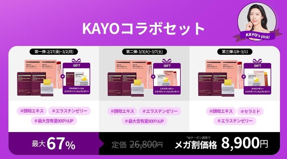 KAYOさんのオススメ商品を厳選した「KAYOセット」がメガ割限定で全三弾に分かれて登場いたします。第一弾は高純度グルタチオンを主成分とする美白サポートサプリのグルタチオンダイレクト9Xフィルム2箱セットと肌の弾力とハリをサポートするエラスチンゼリー2箱セットに加え、さらにもう1箱グルタチオンダイレクト9Xフィルムと肌のくすみ改善や明るさアップなど肌の健康に特化したセット構成となっております。美容も健康も内側から磨くことができるお得なセットをぜひ手に入れましょう!