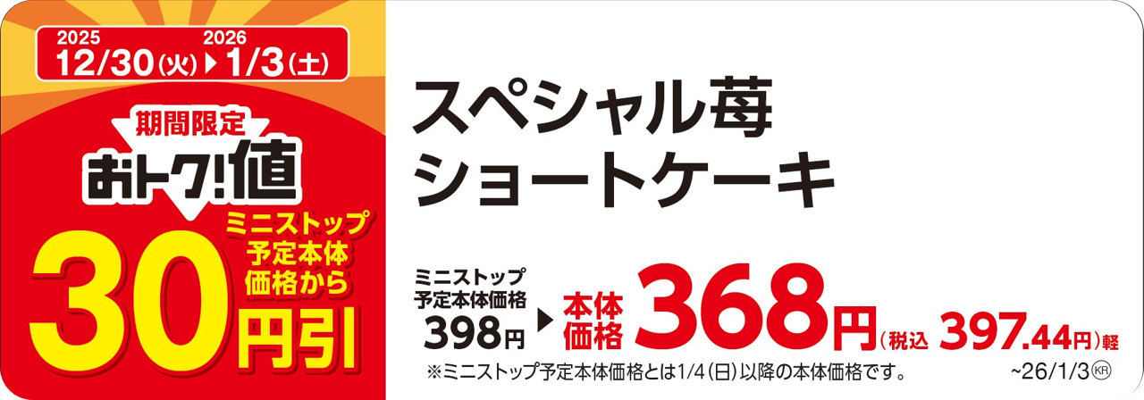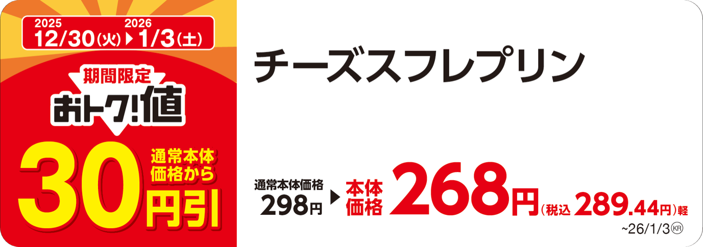 対象のソフトクリーム本体価格より50円引き 2026年1月1日(木)~4日(日) 対象のカップスイーツ5品本体価格より30円引き 2025年12月30日(火)~2026年1月3日(土)