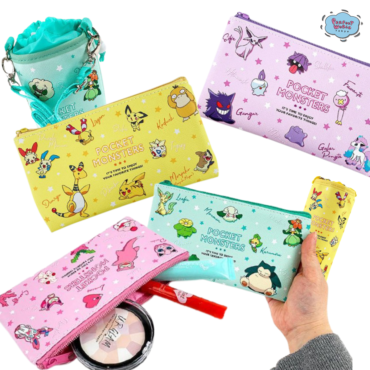 人気のポケモンから、新商品が到着しました。4種類のカラー別にそれぞれのカラーのポケモンが勢揃いしている楽しいデザインのポーチ&ペットボトルカバーです。これからの季節にもピッタリな、明るいパステル調のカラーが揃いました。