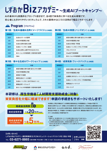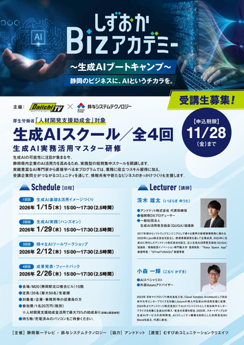株式会社クロスデバイス(本社:静岡県浜松市、代表取締役社長:早川 達典)の100%子会社で、メディア・マーケティング・教育事業を担う、むすびめコミュニケーションクリエイツ株式会社(本社:東京都千代田区、取締役社長:中尾 文宏)は、静岡県内の企業を対象に、AI活用の第一歩を支援する実践型セミナー「しずおかBizアカデミー ~生成AIブートキャンプ~」を株式会社静岡第一テレビ(本社:静岡県静岡市、代表取締役社長:黒岩 直樹)、鈴与システムテクノロジー株式会社(本社:静岡県静岡市、代表取締役社長:林田 敏之)、アンドドット株式会社(本社:東京都渋谷区、代表取締役:茨木 雄太)と4社合同で開講し、第一期受講生の募集を開始します。