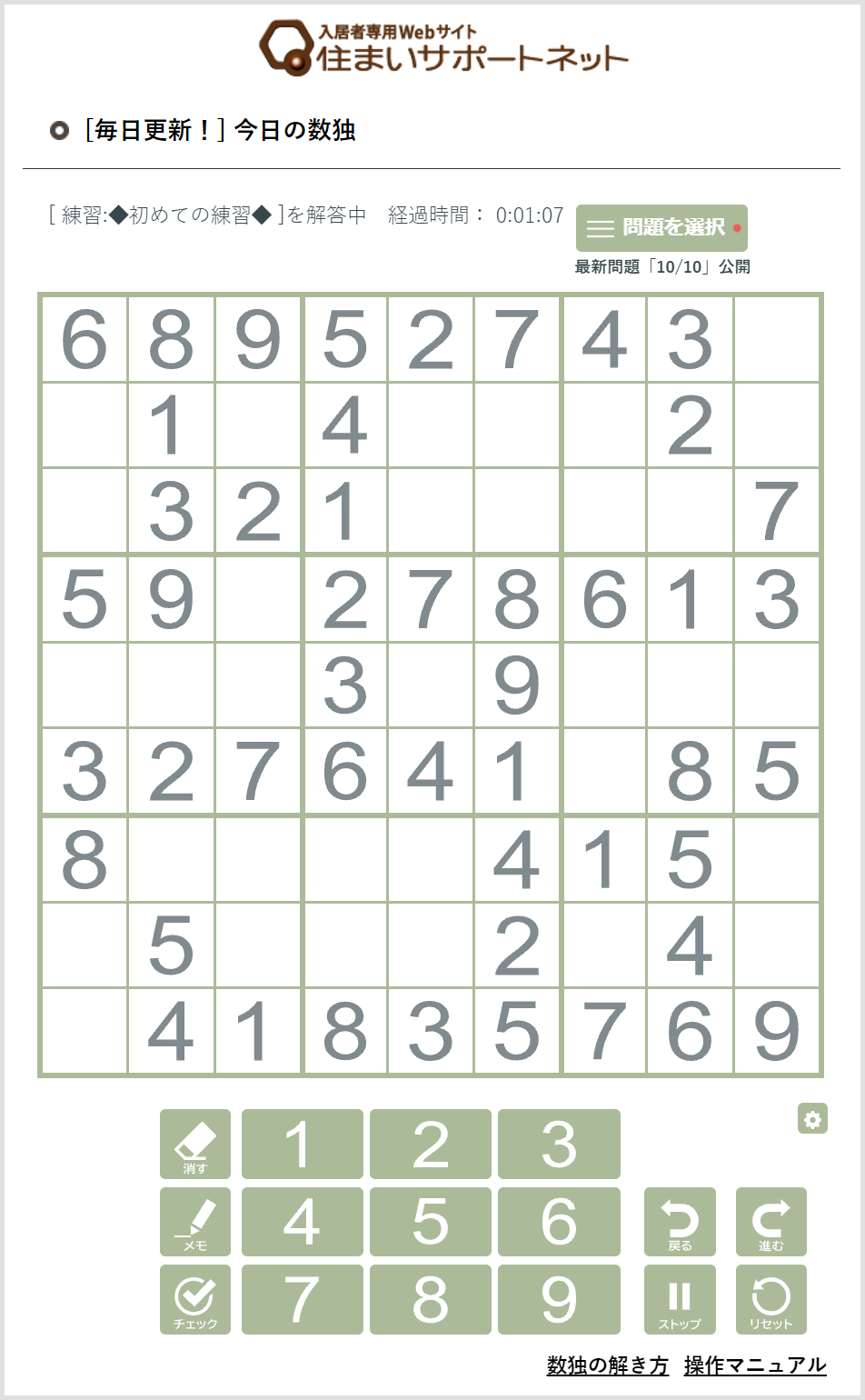 シンプルなルールなのに奥が深く、小さい子から高齢者まで脳ストレッチができる数独。住まいサポートネットの「今日の数独」を毎日の日課としてお楽しみいただけます。