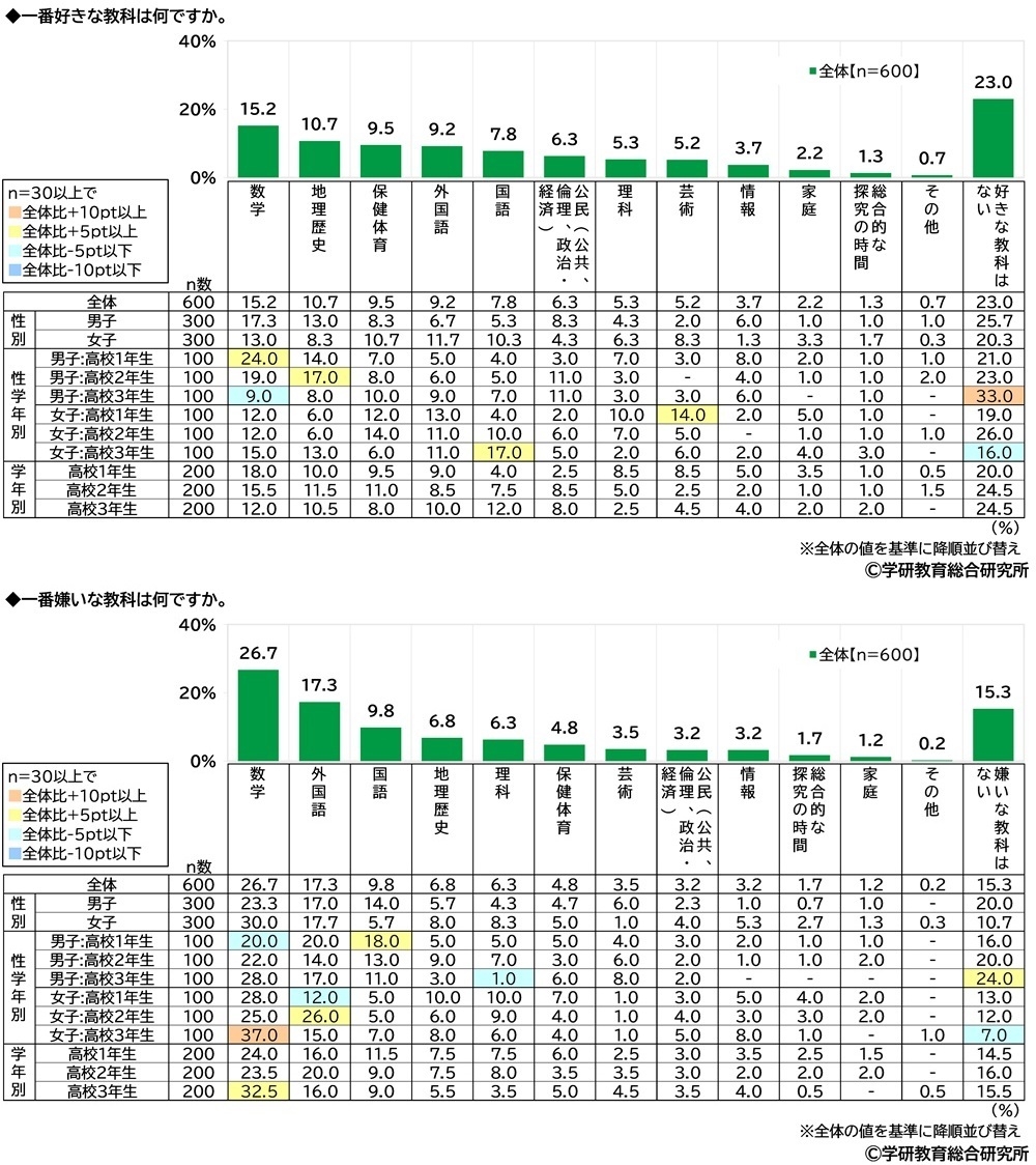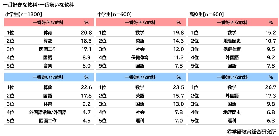 また、中学生と高校生では、一番好きな教科はともに1位「数学」、一番嫌いな教科もともに1位「数学」となり、中学生では一番好きな教科の2位は「英語」、3位は「社会」、一番嫌いな教科の2位は「英語」、3位は「国語」、高校生では一番好きな教科の2位は「地理歴史」、3位は「保健体育」、一番嫌いな教科の2位は「外国語」、3位は「国語」となりました。