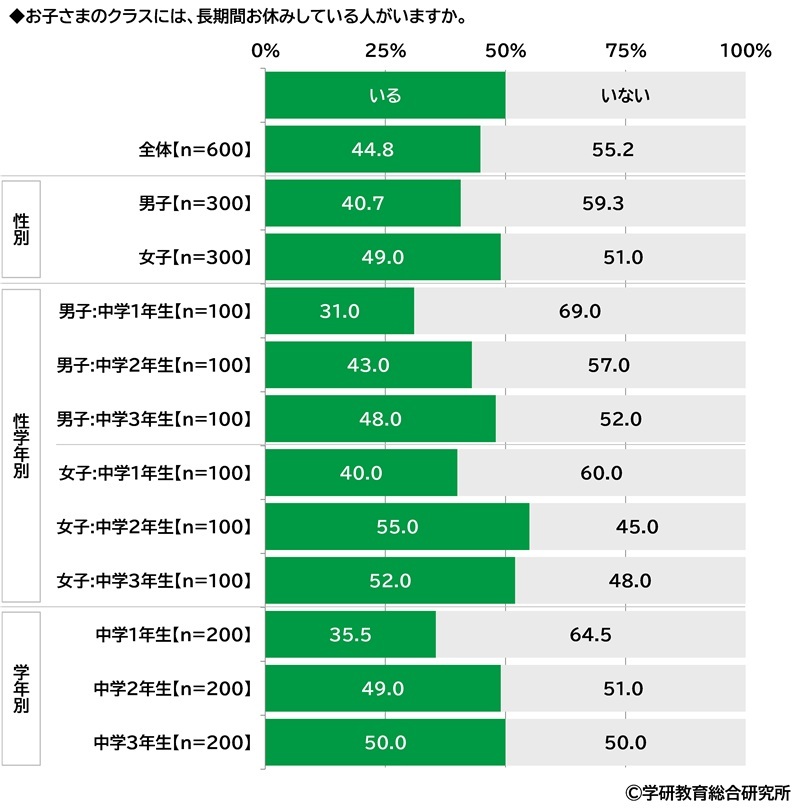 「クラスに長期間お休みしている人がいる」小学生の26%、中学生の45%、高校生の29%小学生と中学生では上の学年、高校生では下の学年で高くなる傾向クラスに長期間お休みしている人がいるかをきいたところ、「いる」と回答した人の割合は、小学生では25.8%、中学生では44.8%、高校生では29.3%と、中学生が突出して高くなりました。