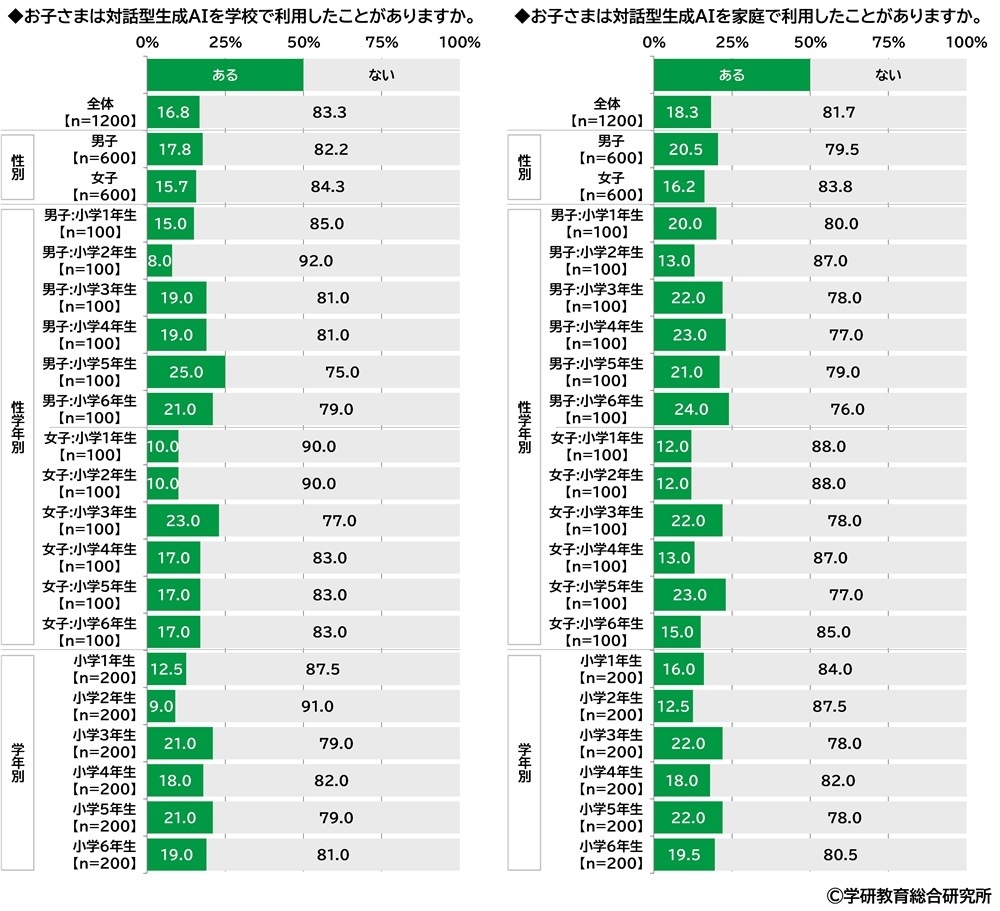 ChatGPTなどの対話型生成AIを【学校】で利用したことがあるかをきいたところ、「ある」は16.8%となりました。また、対話型生成AIを【家庭】で利用したことがあるかをきいたところ、「ある」は18.3%となりました。