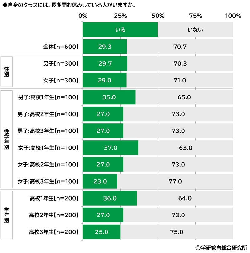 ★「クラスには、長期間お休みしている人がいる」29%、1年生では36%