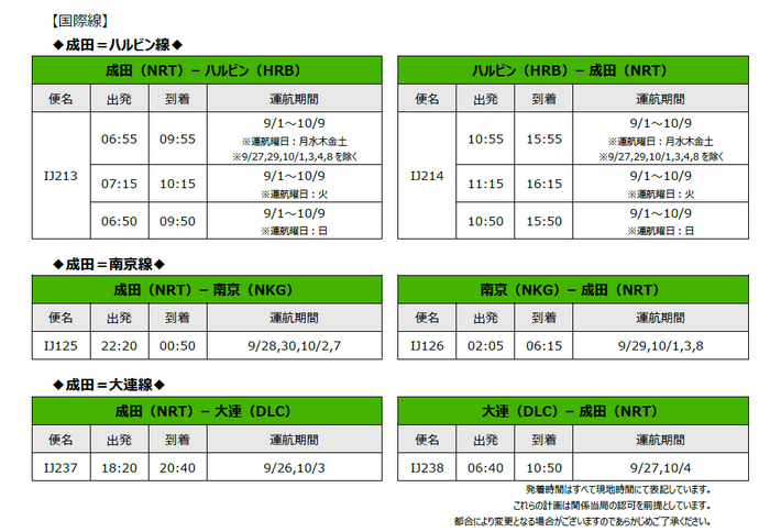 スプリング・ジャパン 2025年度夏ダイヤ国際線(第6弾)・国内線の追加販売について スプリング・ジャパン株式会社 2025-07-09 13:00 JALグループのLCCであるスプリング・ジャパン株式会社(以下:スプリング・ジャパン)は、成田=ハルビン線、南京線、大連線、および新千歳線の増便を以下のとおり決定し、本日15時より販売を開始します。最新のダイヤおよび販売状況につきましては、スプリング・ジャパン公式サイトをご覧ください。 なお、2025年夏ダイヤの運航便に関するご案内は以上となります。さらに追加で販売する場合は、あらためてWebサイトにてご案内します。 【国際線】 【国内線】 SPRING JAPAN公式サイト - 格安航空券の予約検索 SPRING JAPAN公式サイトでは毎日リーズナブルな価格の航空券を予約できるほか、割引セール情報も常時ご提供しています。さっそく特典チケットをチェックしましょう。格安チケットの購入はウェブサイトだけではなく、スマホサイト、コールセンターも気軽にご利用ください。 https://jp.ch.com/ ジャンル: 旅行・お出かけ BtoB・ビジネス ライフスタイル 画像一覧 一括ダウンロード