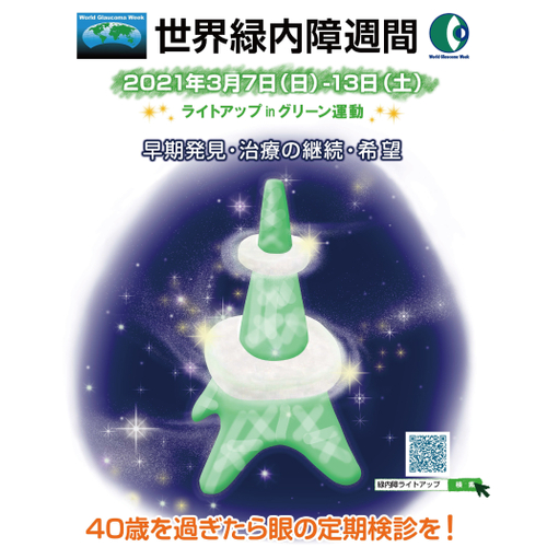 今年の「ライトアップinグリーン運動」は「早期発見・継続・希望」をキーワードに全国各地の公共施設や医療機関などを緑色にライトアップして、正しい緑内障の知識を広めていくことを目的に取り組みます。
