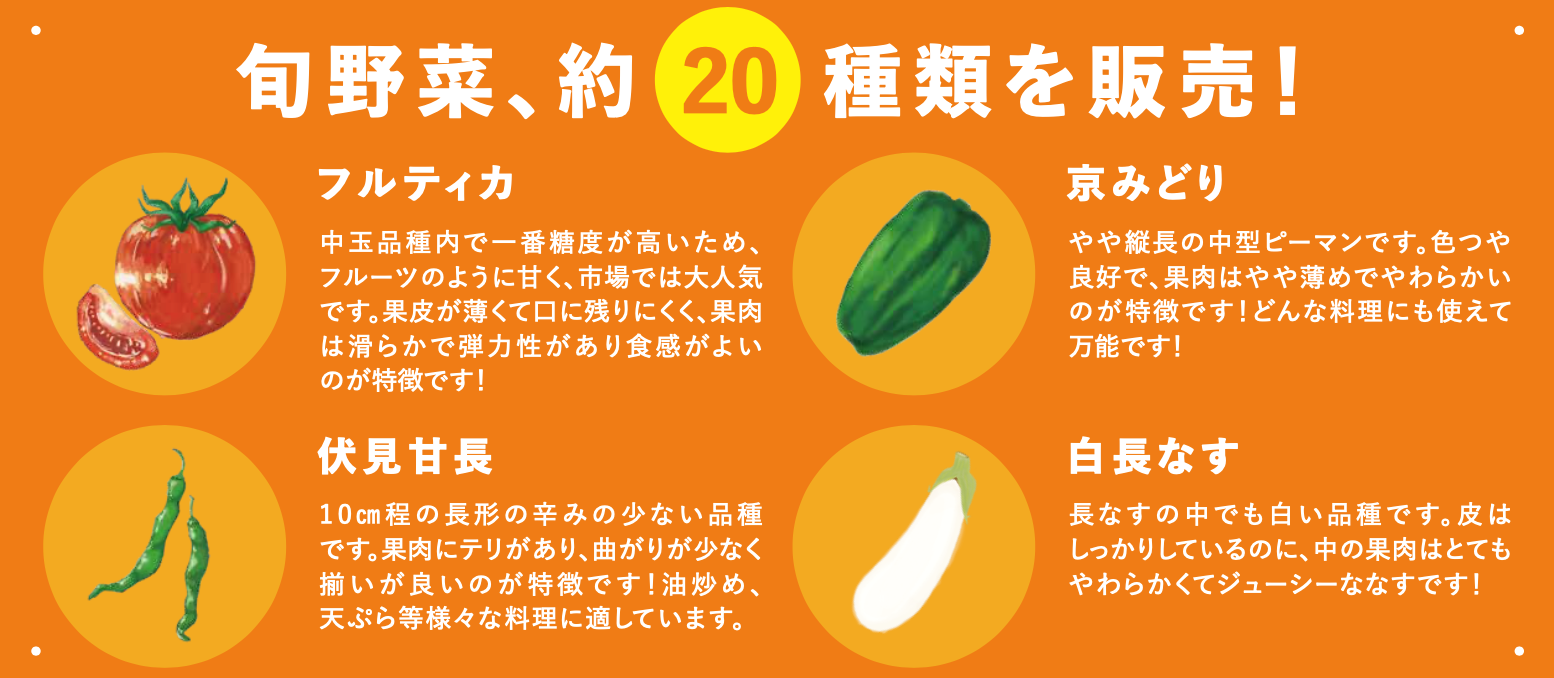 フルティカ(トマト)、京みどり(ピーマン)、伏見甘長(ししとう)、白長なす(なす) など