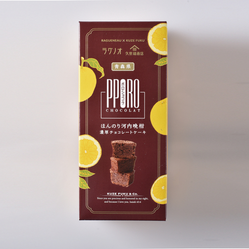 今回は、その濃厚さとしっとりとした食感で全国に多くのファンを持つ「ポロショコラ」とコラボレーションさせていただきました。ラグノオささき様のご協力を得て、久世福商店の商品ラインナップの中には今までなかったチョコレートケーキに挑戦。久世福商店らしさを表現するために、チョコレートと相性の良い国産果実を探し、熊本県の「河内晩柑」にたどりつきました。果皮のさわやかな酸味とほのかな苦みをほんのりきかせることで、もともとの「ポロショコラ」のおいしさを残しながら、チョコレートと国産柑橘のハーモニーを楽しんでいただける商品となりました。