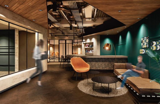 シックでもあり、カジュアルでもある、どんな企業でも非常に順応しやすい内装のオフィスです。外観は、中の様子がダイレクトに見えないように木製フェンスで目隠しが付いています。