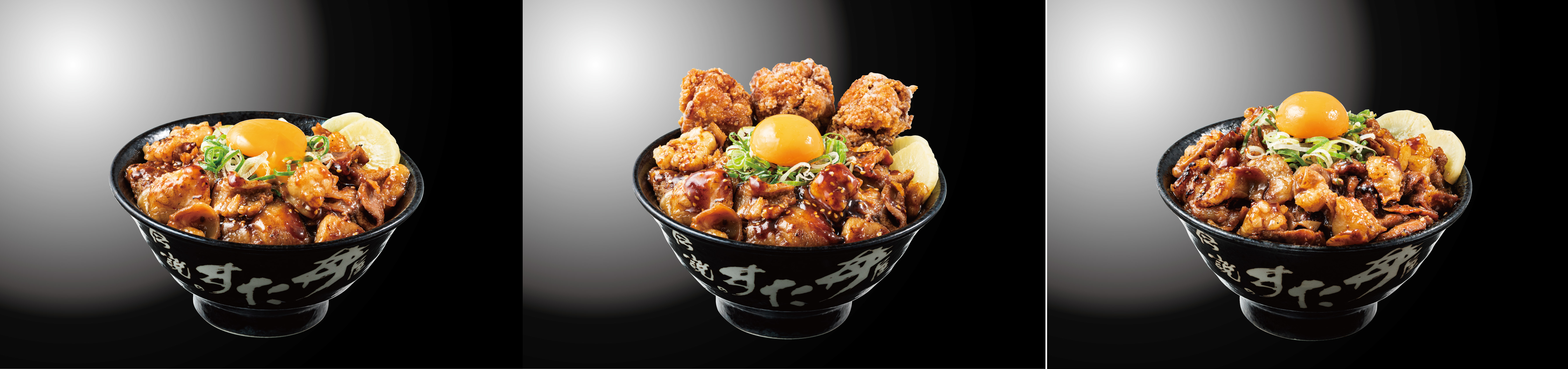 左から『すたみなWホルモン焼肉丼』『唐揚げ合盛りすたみなWホルモン焼肉丼』『すたみな特盛Wホルモン焼肉丼』