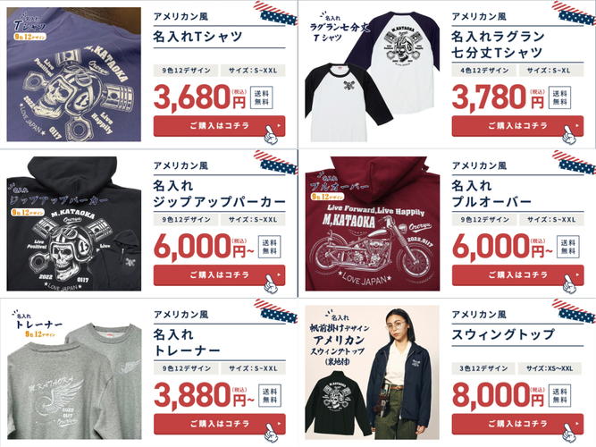 アメリカンシリーズは、カスタマイズ可能なデザインが特徴のラインナップです。デザインはバイクやエンジン、ピストンなど、アメリカンカルチャーにインスパイアされた力強いモチーフが揃っています。これらのデザインにお名前や日付を入れることができ、オリジナルのTシャツ、パーカー、タオルなどを作成できます。アメリカンスタイルのクールなアイテムで、個性を表現できるだけでなく、特別なギフトとしても喜ばれること間違いなしです。