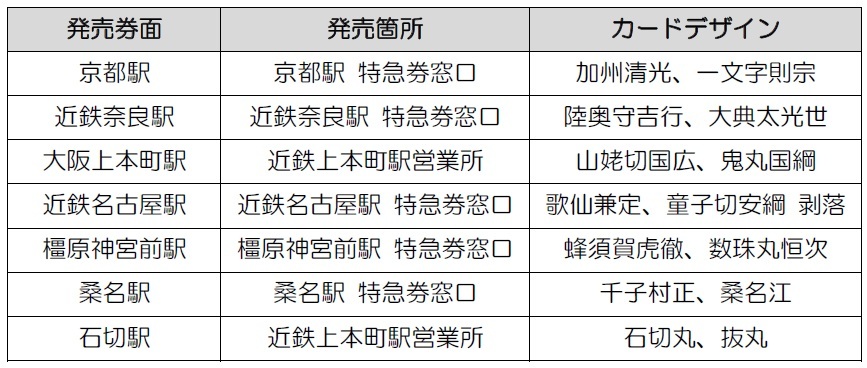コラボ企画の実施を記念して、各駅にて異なる刀剣男士のオリジナルカード付き記念入場券を発売します。