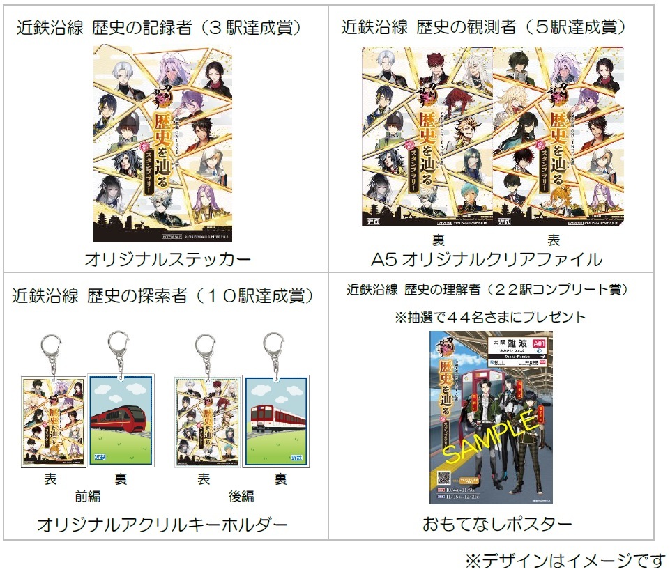 本企画では、「刀剣男士」と「近鉄沿線の歴史を学ぶ旅」をテーマに、22駅のチェックポイントからデジタルスタンプを集めていただきます。チェックポイントとなる駅構内では「おもてなしパネル」、「おもてなしポスター」と称し、「始まりの五振り」などの刀剣男士たち120振りのパネルやポスターを展示します。