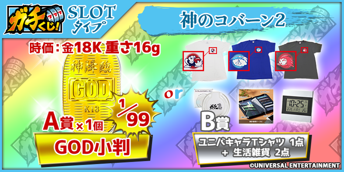 また、ユニバーサルエンターテインメント社の伝説的パチスロ機シリーズ「ミリオンゴッド」のアイテムも“神降臨!!”神々しい「GOD」シンボルをデザインにあしらった18金素材で黄金色に輝く「GOD小判」(重さ:16g 材質:18K)がA賞に登場します。