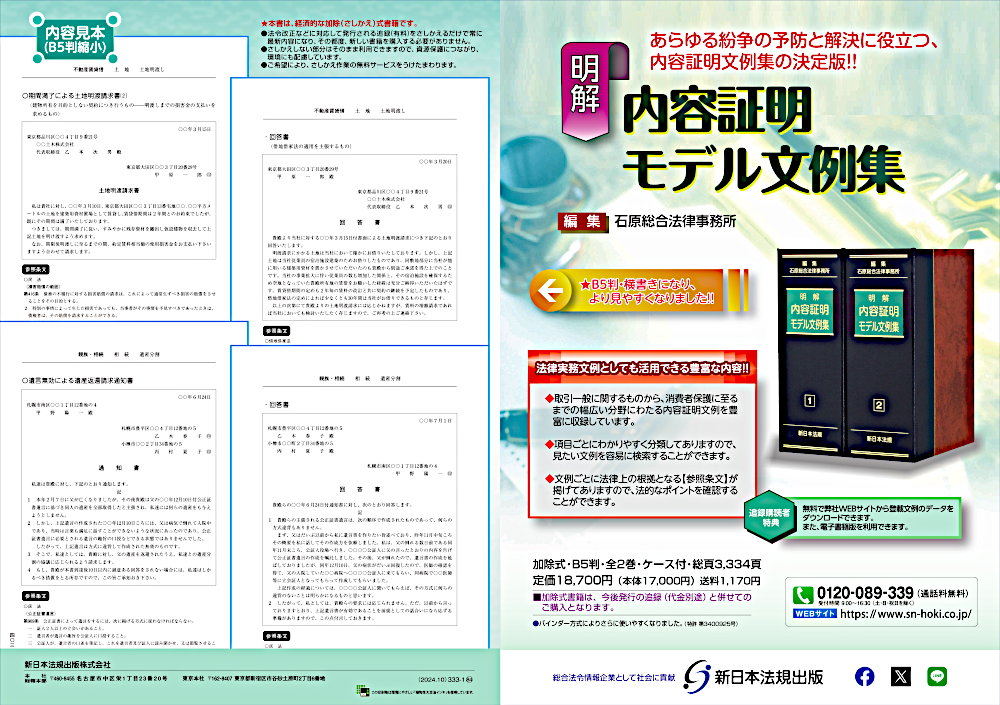 新日本法規出版株式会社(所在地:愛知県名古屋市中区、代表取締役社長:河合誠一郎)は、「明解 内容証明モデル文例集」(編集:石原総合法律事務所)を増刷し、2024年11月8日(金)に入荷いたしました。