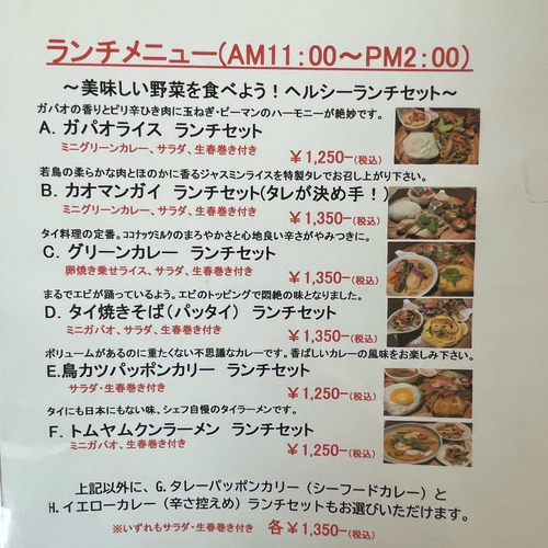 ガパオライス・カオマンガイ・タイカレー・パッタイ等のセットメニューをお楽しみください。