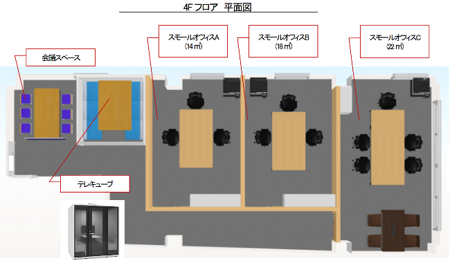 オフィス家具、複合機など家具や備品の他、会議室などの設備が充実した、少人数で入居できるプライベートオフィス(個室)です。