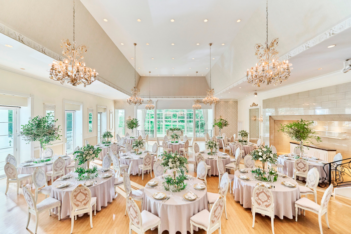 たくさんの窓から自然光が差し込む、アットホームさと華やかさを兼ね備えた邸宅。大人可愛いからナチュラルまで、自由自在に彩ります。ヒロインになった気分で登場できる、階段入場も人気。