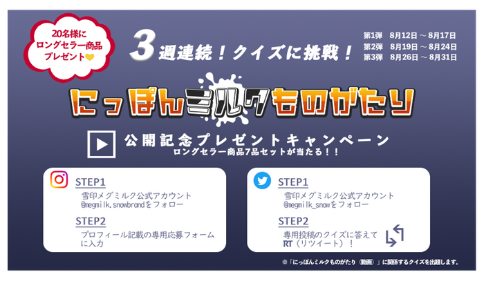 企業公式TwitterおよびInstagramで、8月12日から3週にわたり、「にっぽんミルクものがたり」に関連したクイズを出題し、正解された方の中から抽選で20名様に、「雪印メグミルク ロングセラー商品7品セット」が当たるキャンペーンです。