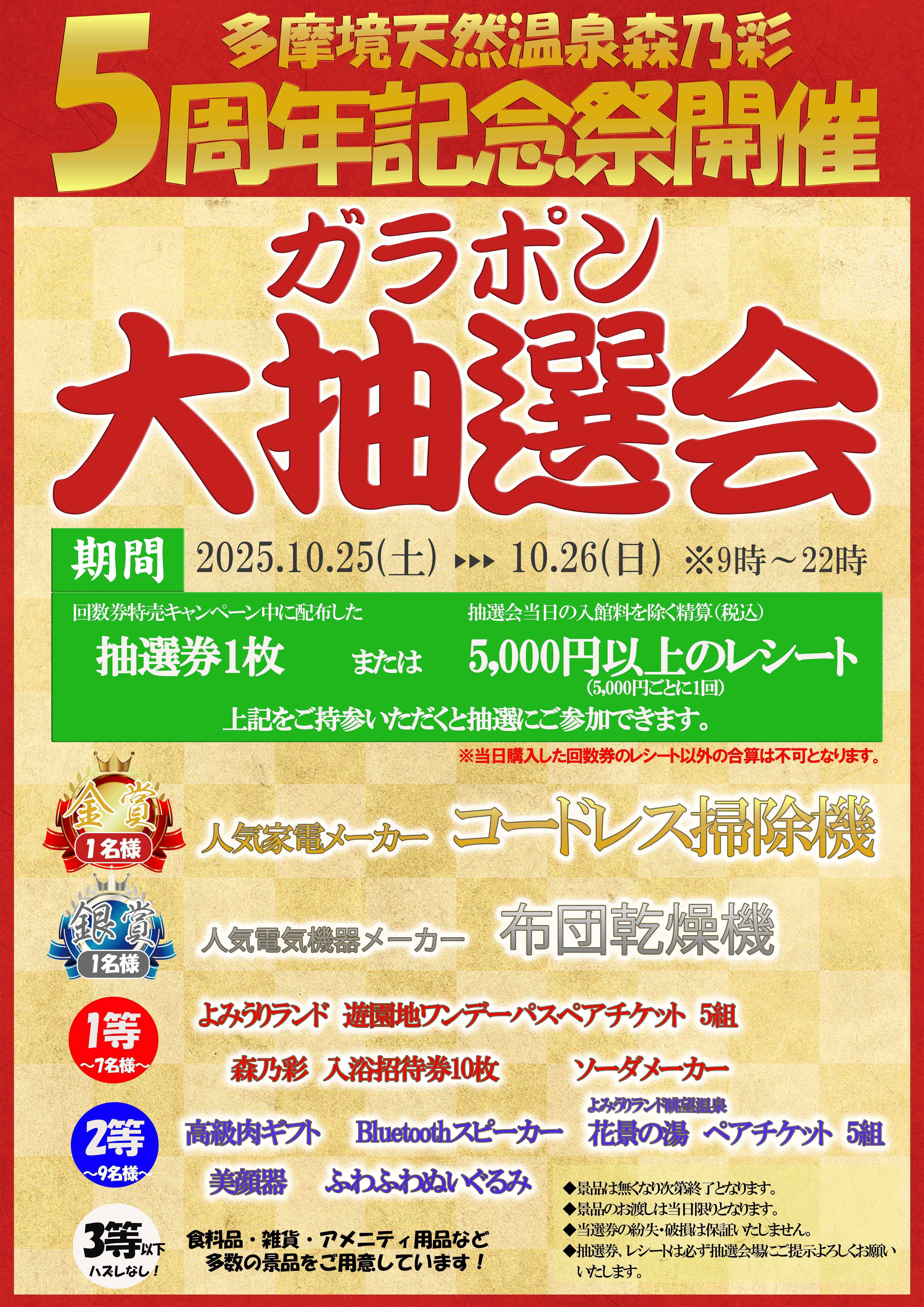株式会社楽久屋(本社:東京都港区、代表取締役:新井 正一)は、2025年10月17日から10月26日まで、東京都町田市の「多摩境天然温泉 森乃彩 (もりのいろどり)」で5周年記念イベントを開催します。