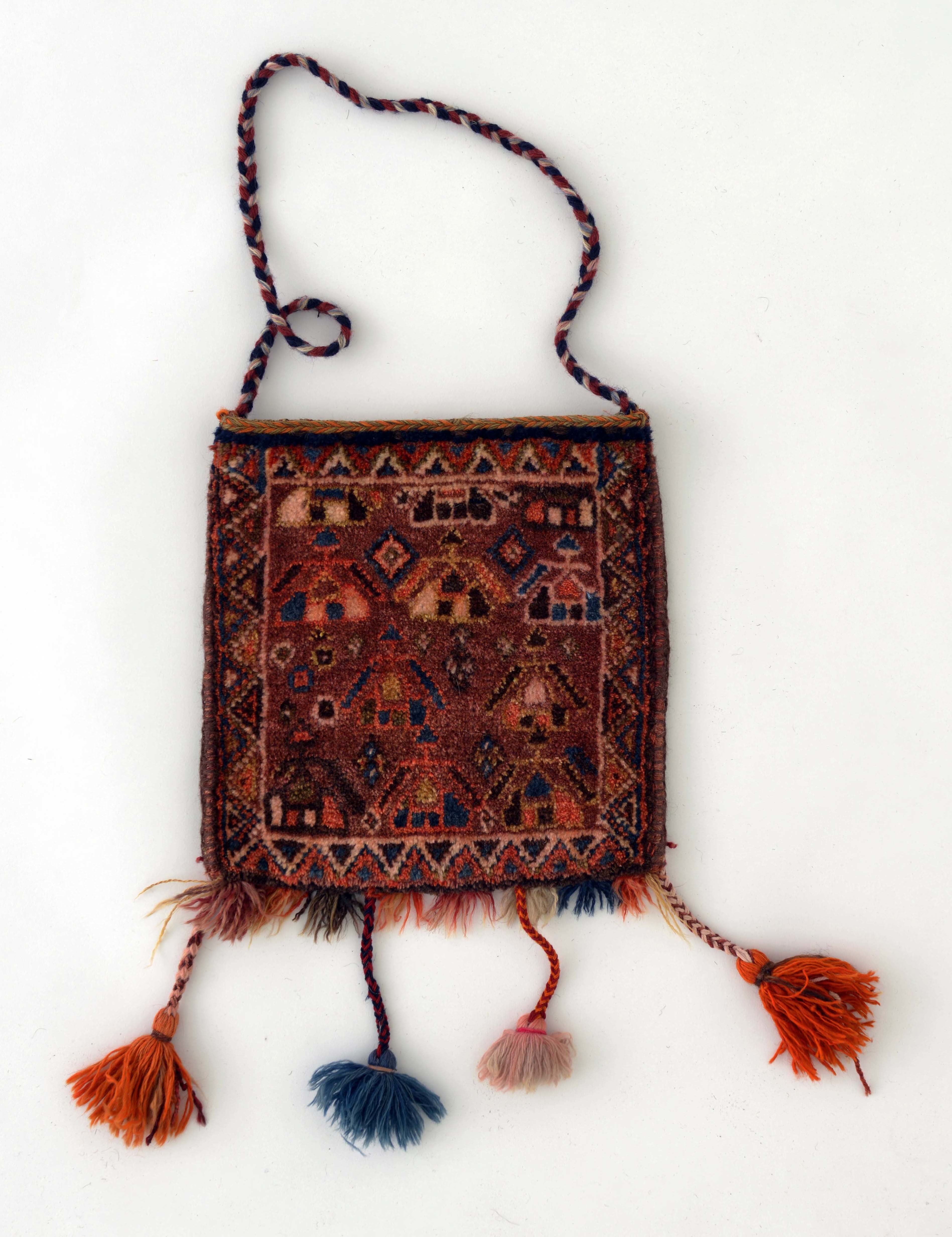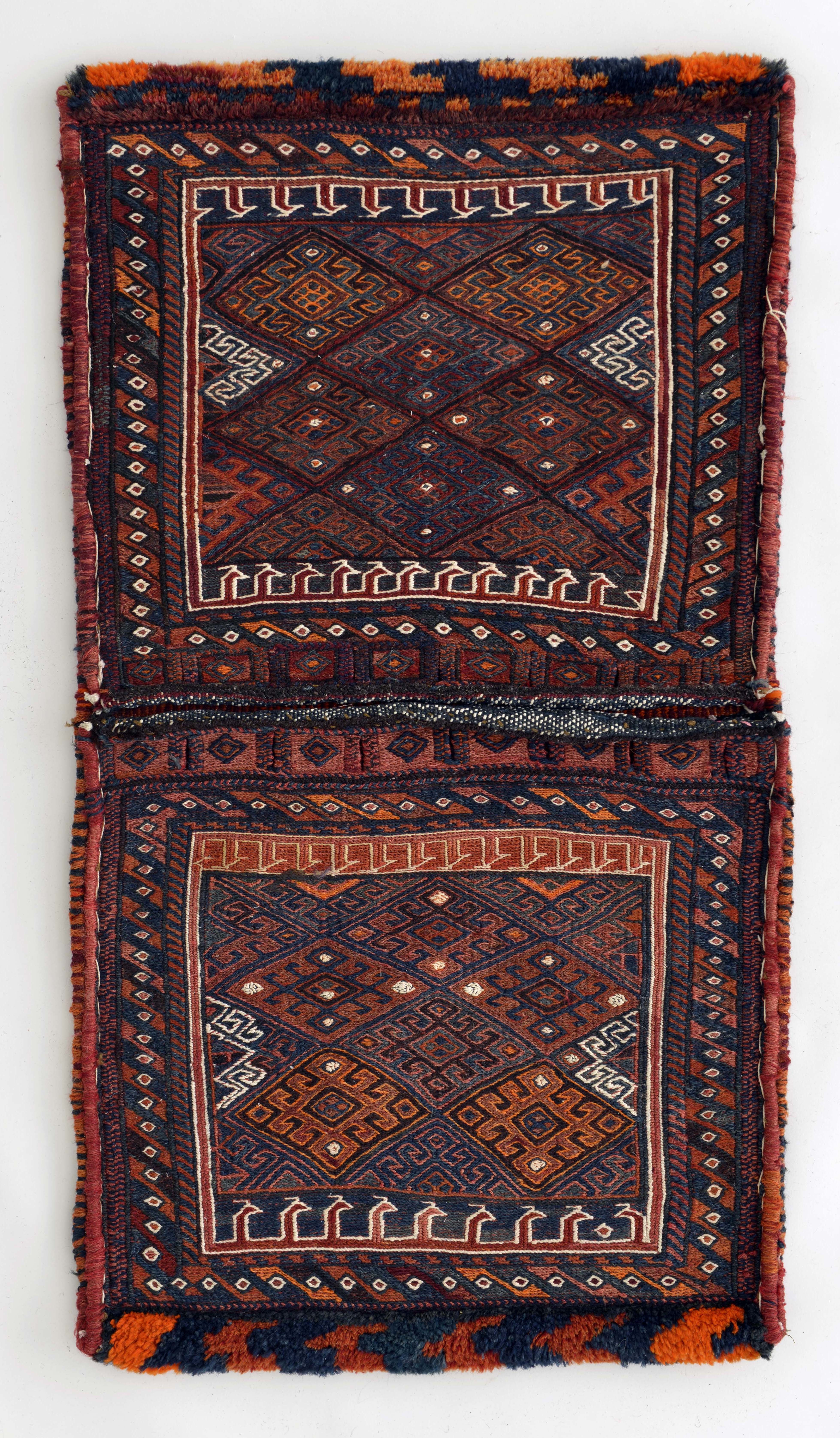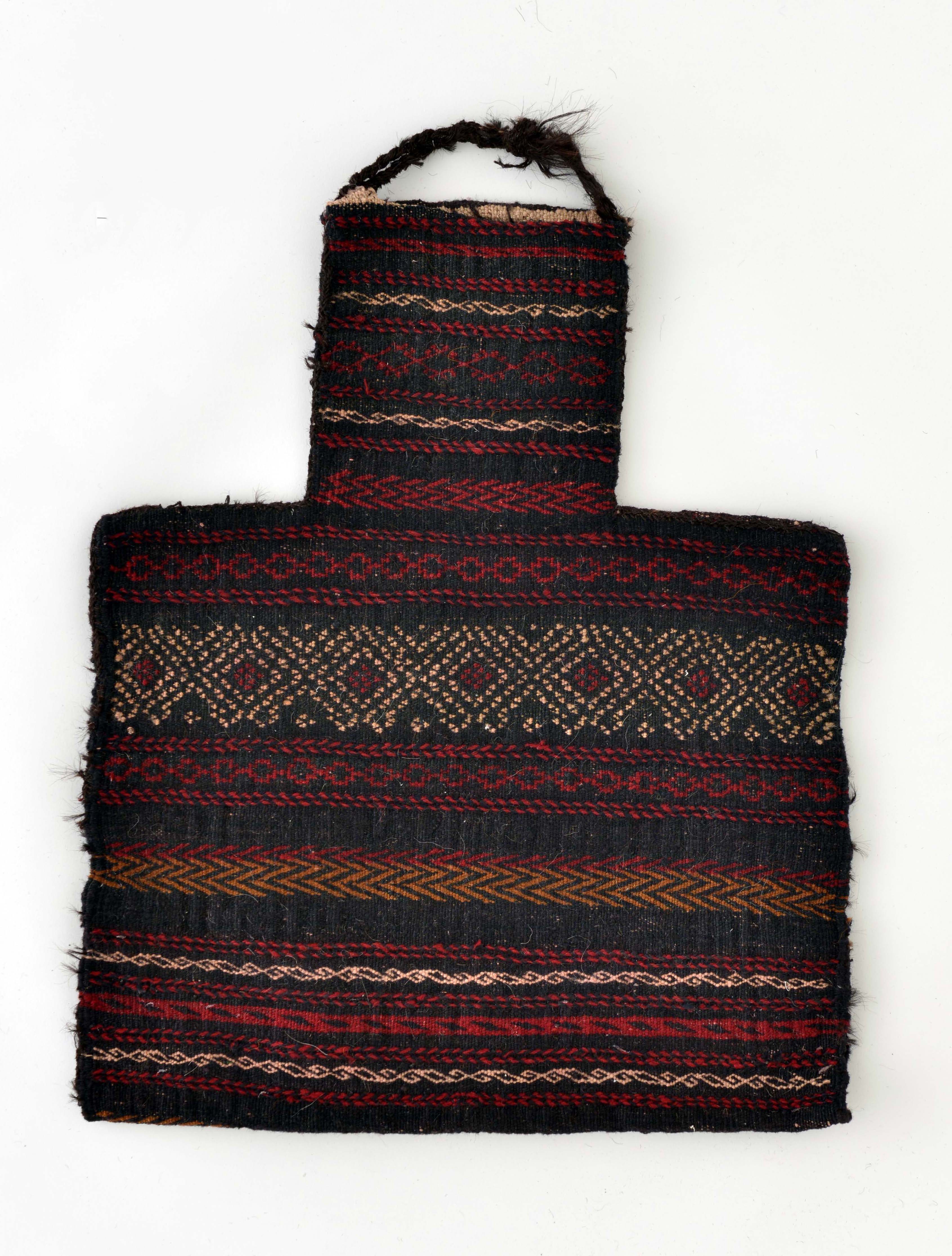 20世紀前半より前、遊牧が盛んだった頃、ロバや馬、ラクダなどの背に左右に振り分け、それぞれに物を入れて移動に使いました。部族を象徴する伝承紋が緻密に織り込まれています。