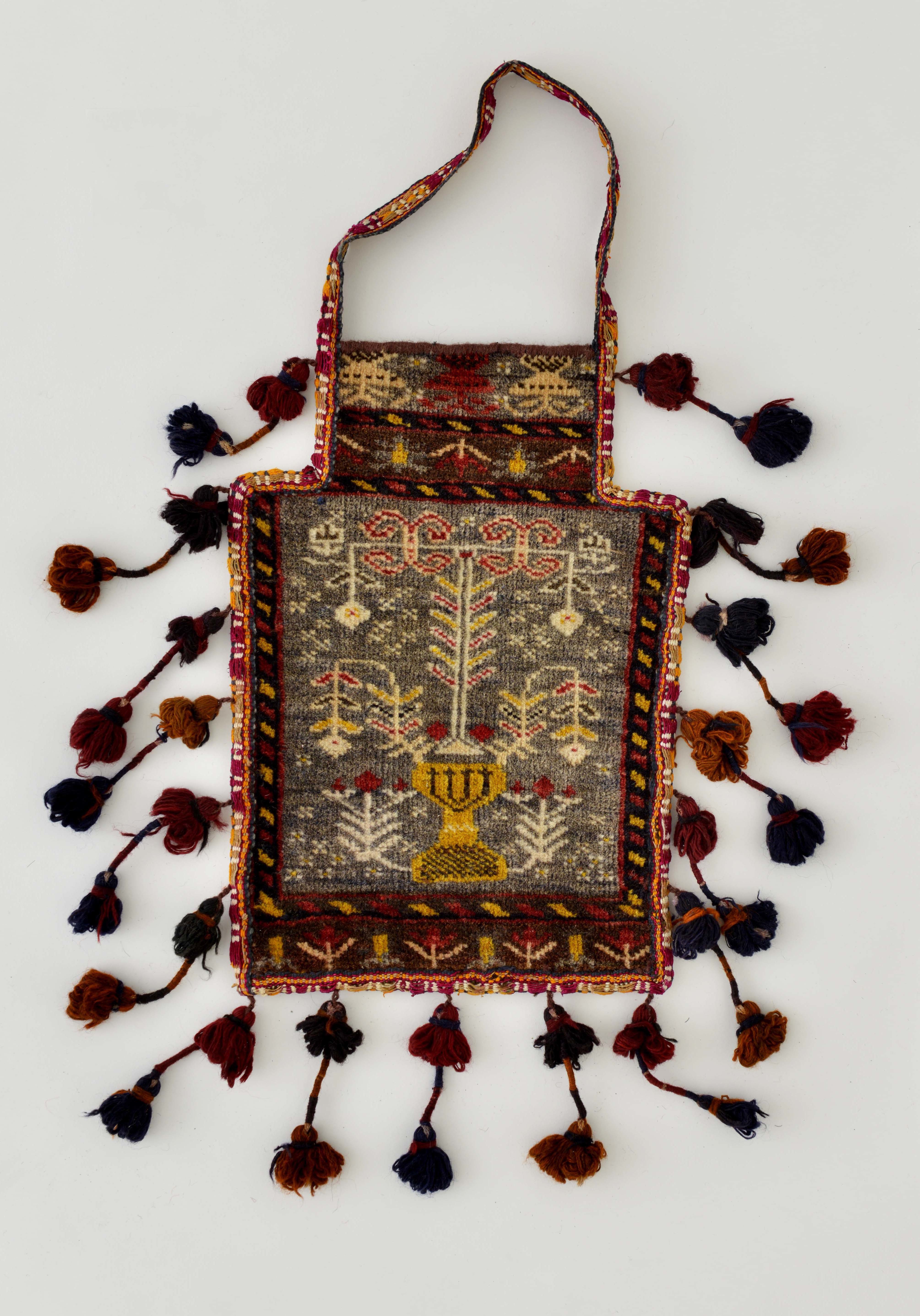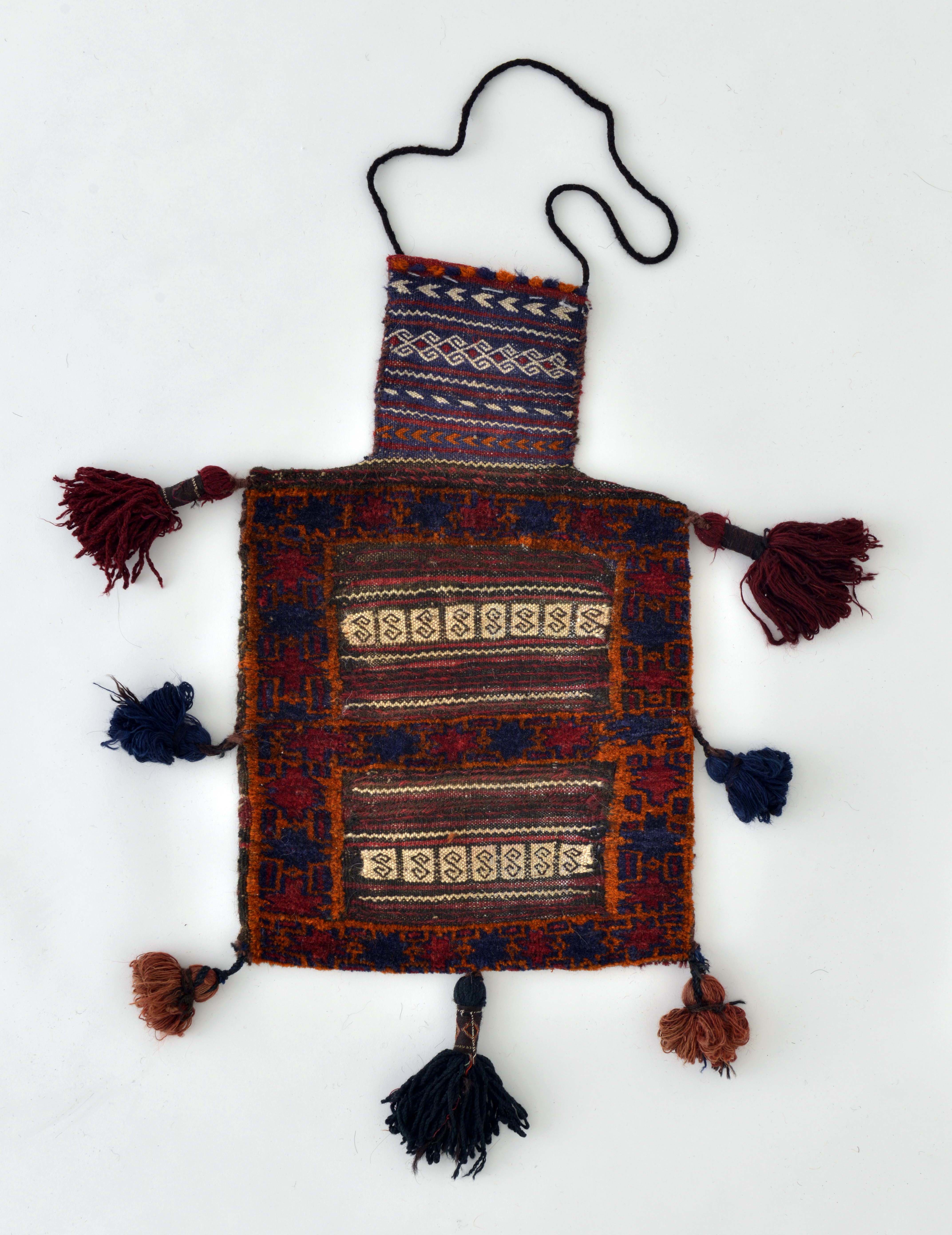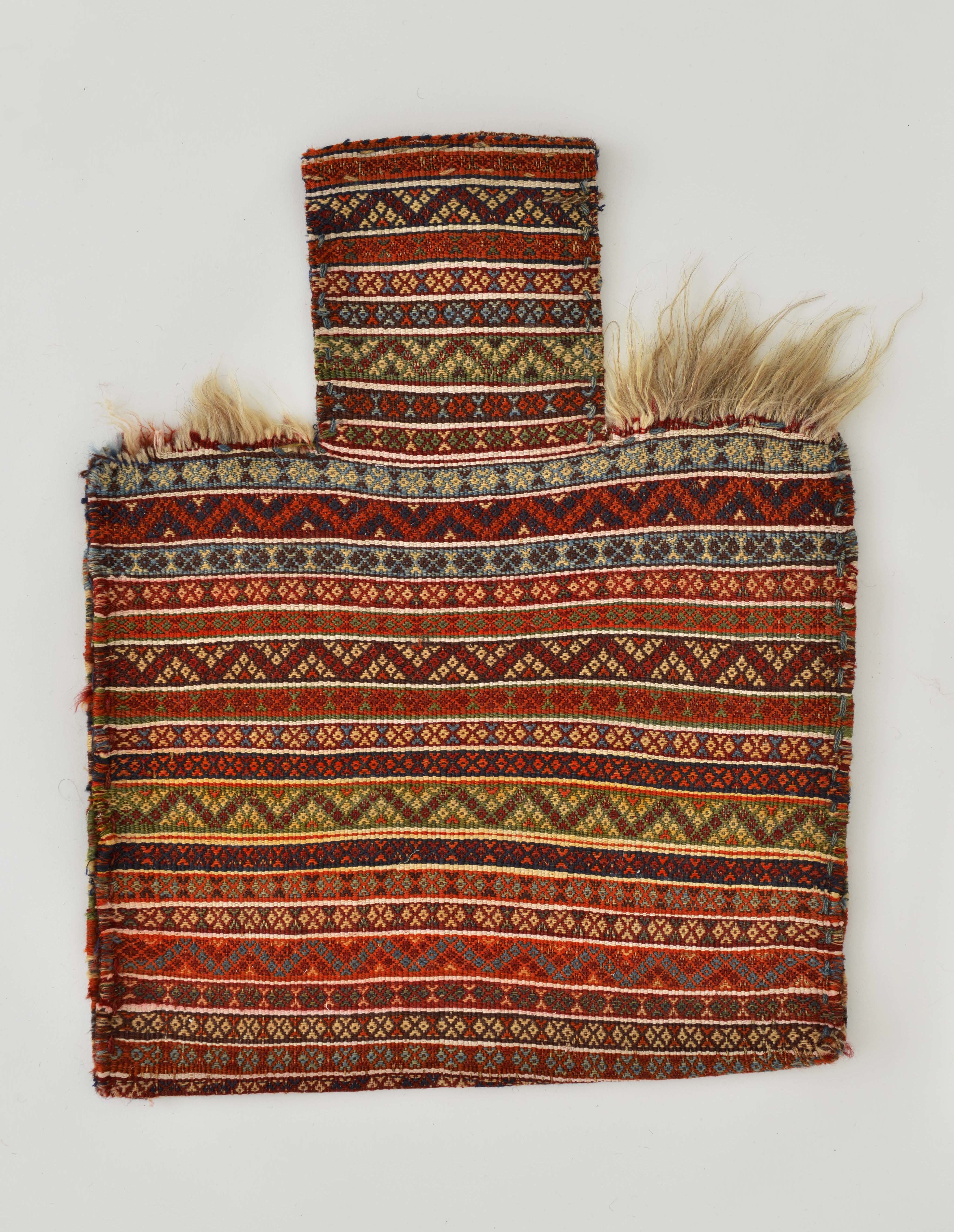 塩を入れるための専用の袋で、イランでは「ナマクダン」と呼ばれます。家畜の頭が入らないように開口部を狭くした凸型をしているのが特徴です。塩を欲しがる家畜の習性を利用して群れをコントロールするなど、遊牧生活に不可欠な“塩の役割”を物語る好資料でもあることから、当館でも注目しています。持ち主がすぐわかるよう、部族を象徴する柄など、特徴的な文様が織り込まれ、房飾りがついたものもあり、染織品として見ても楽しめます。