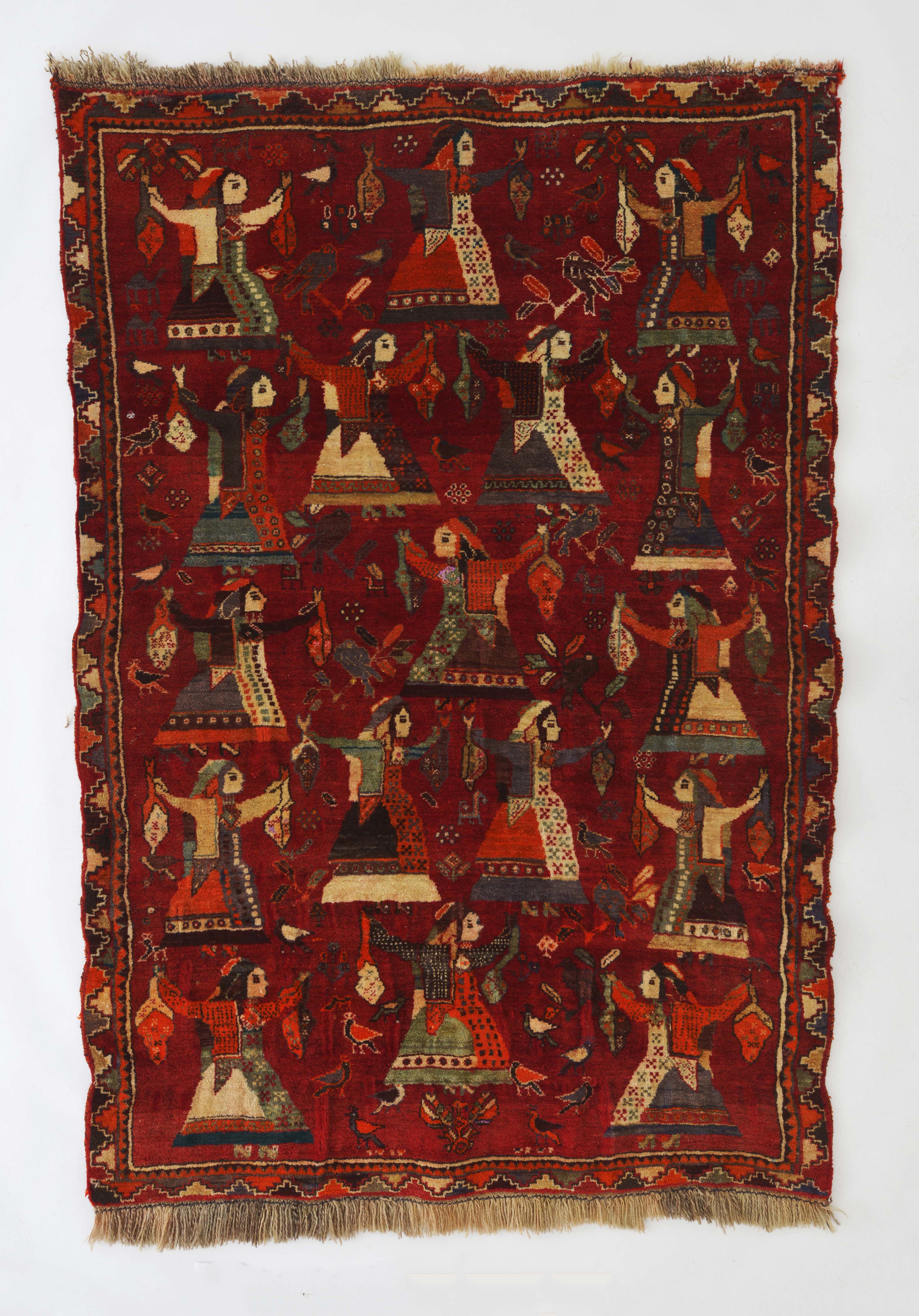 遊牧民の絨毯には、織り手の部族を示す文様や動物、心象モチーフなどが織り込まれています。移動する生活の中で女性が長い時間をかけて織った絨毯は生活用具の一つですが、月日に耐えて長く使用できるため、財産として扱われる一面もあります。強靱な羊毛に天然の素材で染色された深い色合いが相まって独特の存在感があります。
