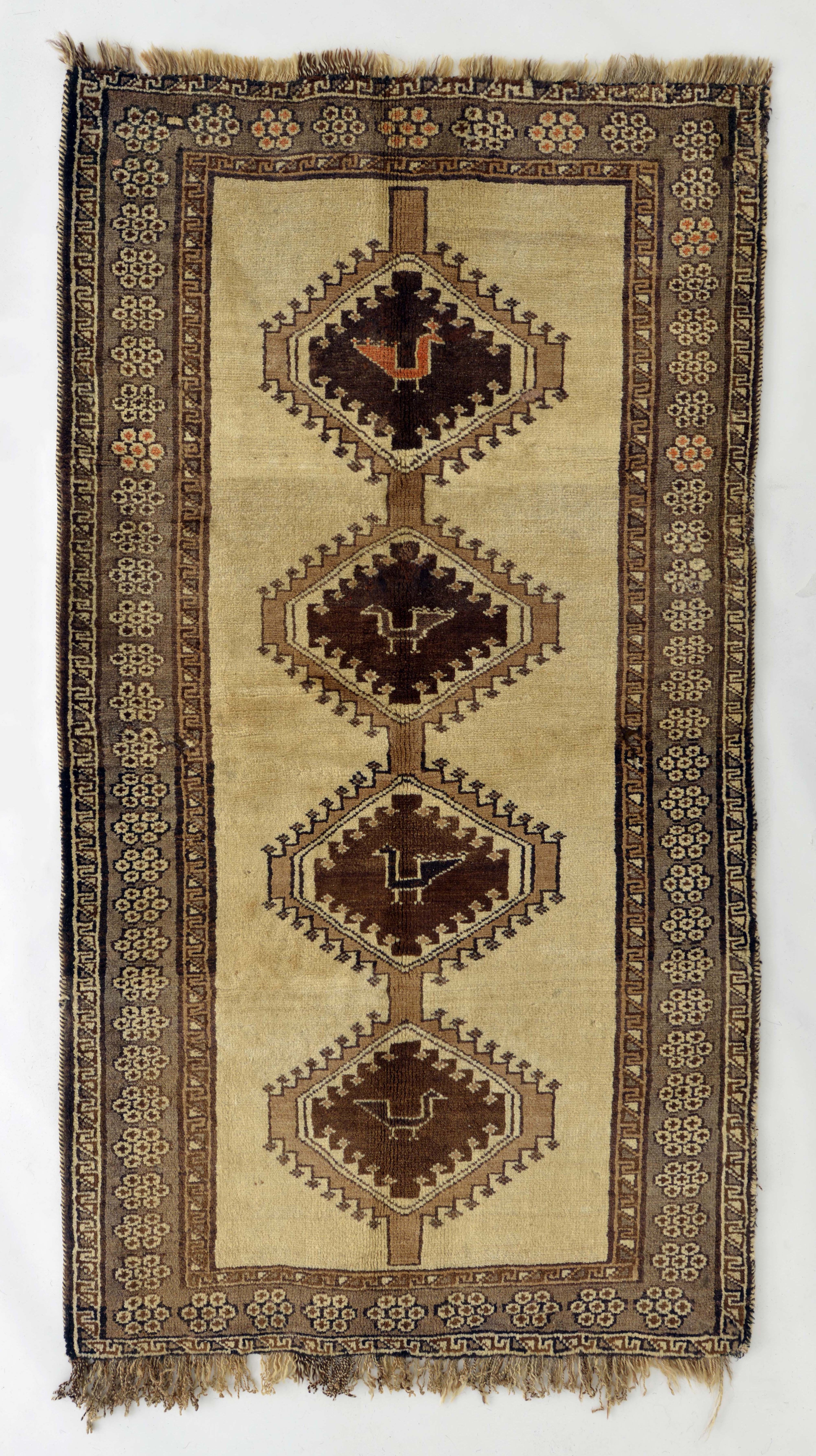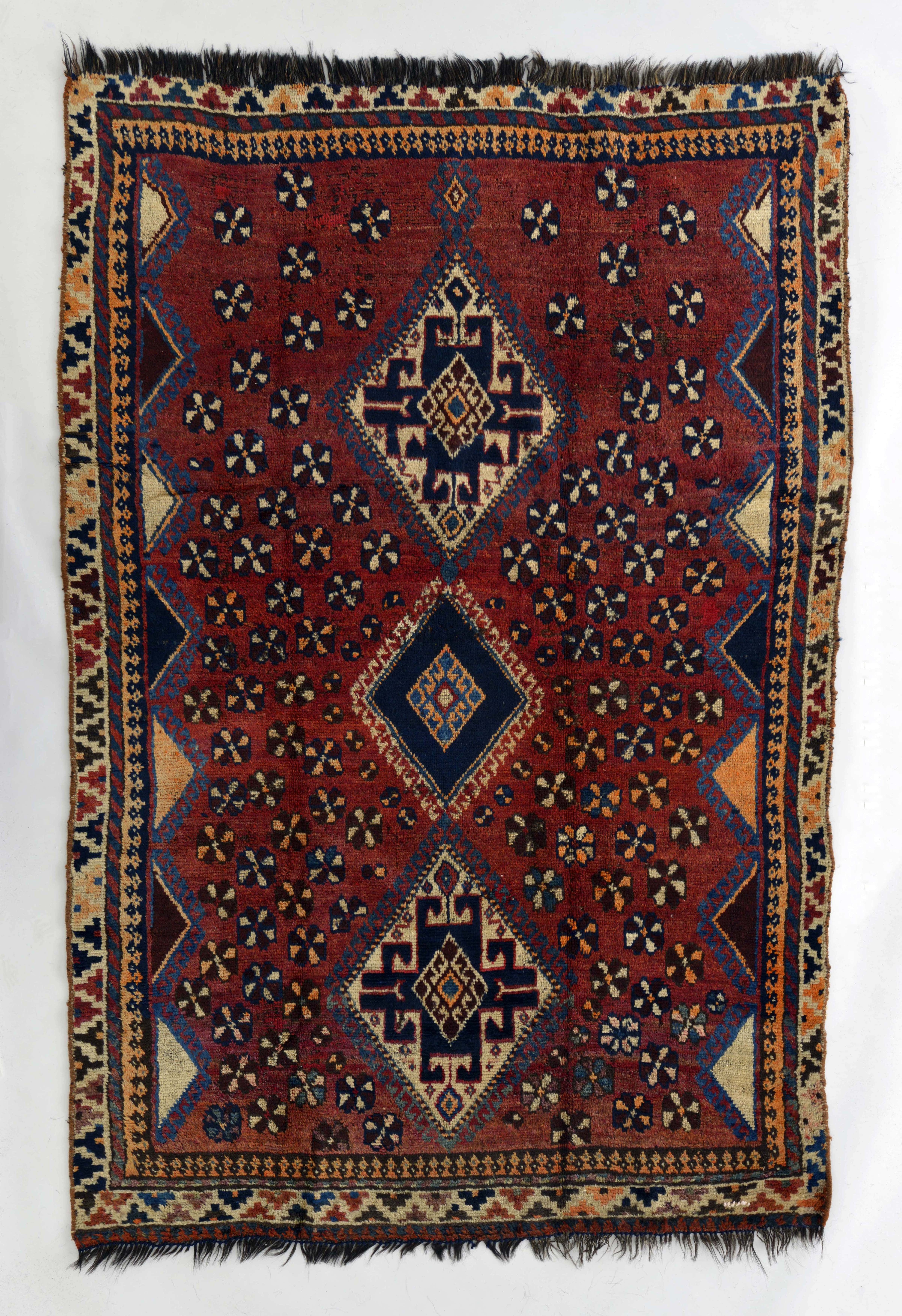 カシュガイ族を象徴する三つのメダリオンが核となった古い絨毯。縦糸には黒山羊の毛が使われ、長い年月の使用に耐えられる強靭さを備えている。