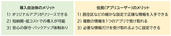 アプリをダウンロードした住民(アプリのユーザー)は、住んでいる地区や年代といった基礎情報を登録することで、必要とする情報を正確に受け取ることができたり、イベント情報やごみに関連する情報、子育てに役立つ情報や防災に関連した情報など、その地域で生活するのに有用な様々な情報を受け取ることができます。