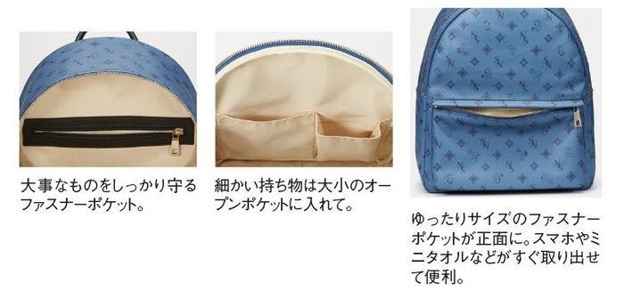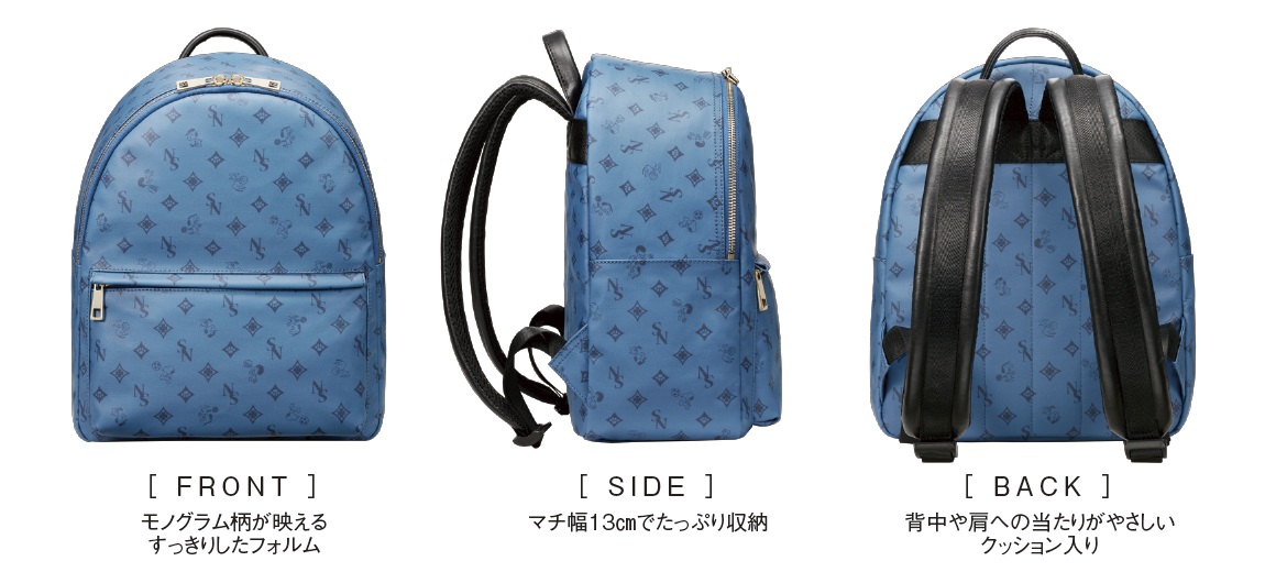 ゴルフにサッカーにテニス、アメフト、バスケといろんなスポーツを楽しむスヌーピーが、かわいい足あとマークや四つ葉のクローバーとともに、さりげなくデザインされているタウンリュック。